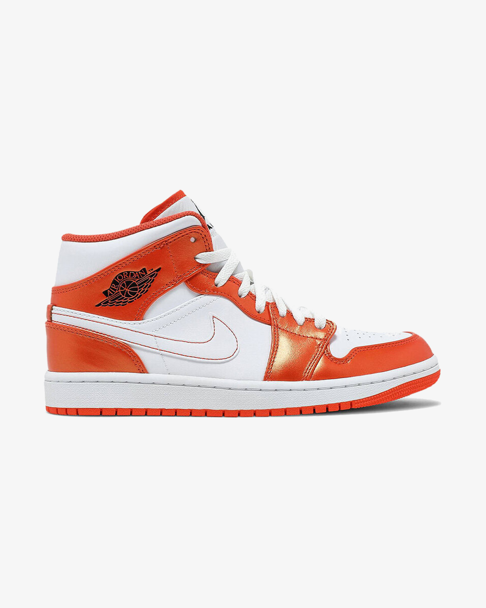 The Air Jordan 1 Mid SE ‘Electro Orange’ carries a white leather upper with contrasting citrus-hued overlays that give off a subtle metallic sheen. Branding elements include a black Jumpman icon atop the woven tongue tag, a matching black Wings logo imprinted on the lateral collar flap, and a white leather Swoosh outlined in orange stitching. The mid-top is mounted on a sturdy rubber cupsole with a polyurethane wedge and encapsulated Air-sole cushioning under the heel.